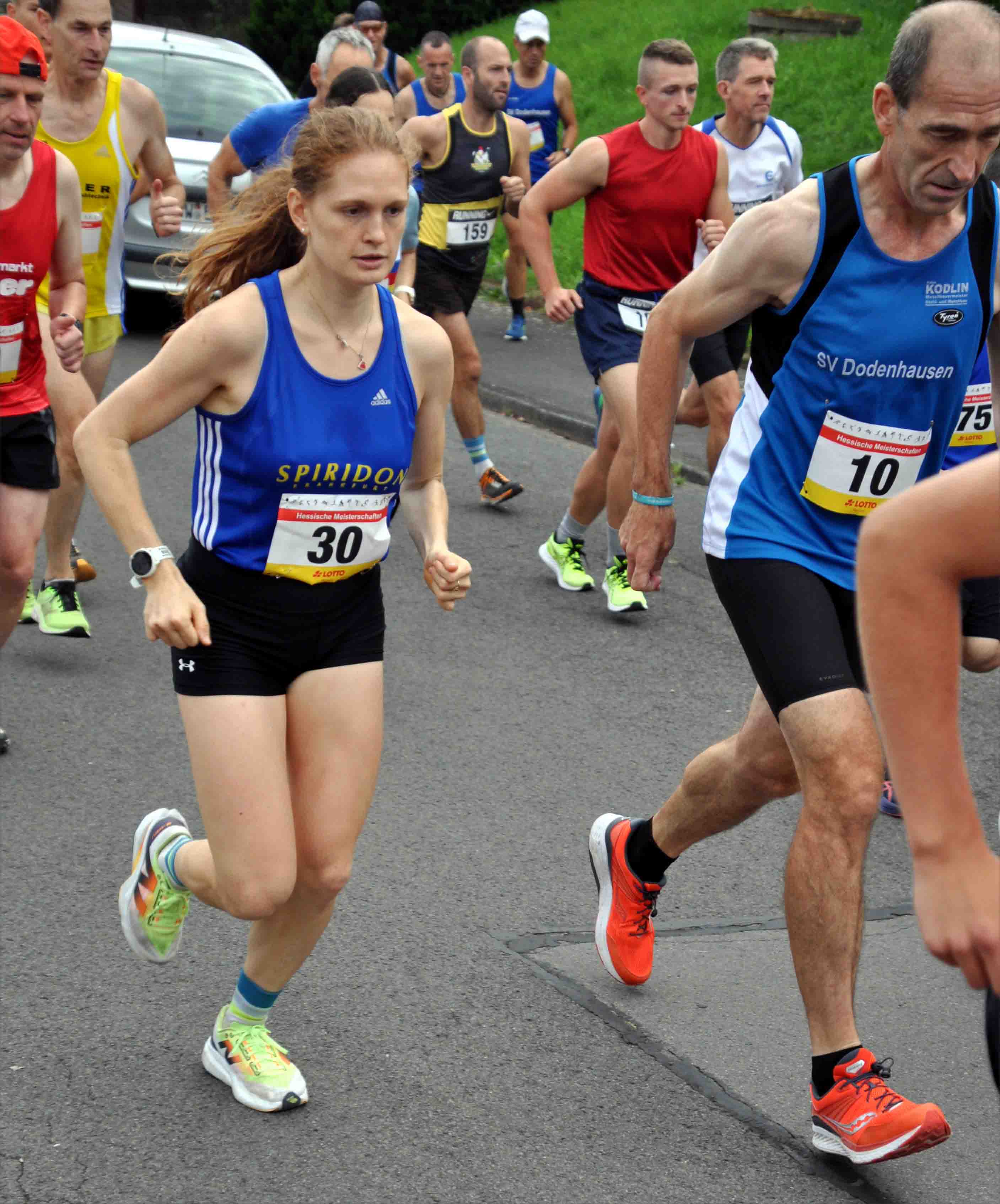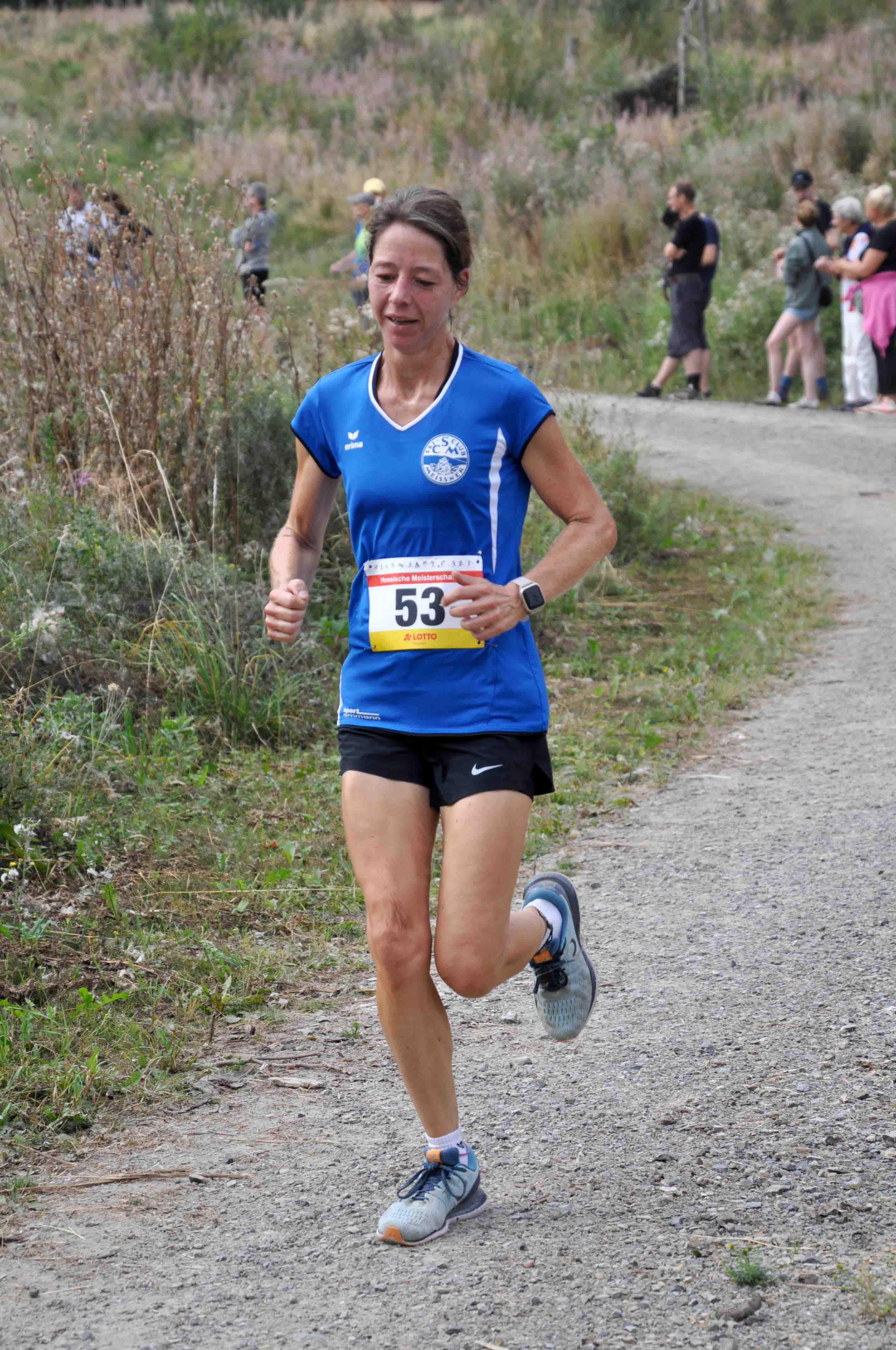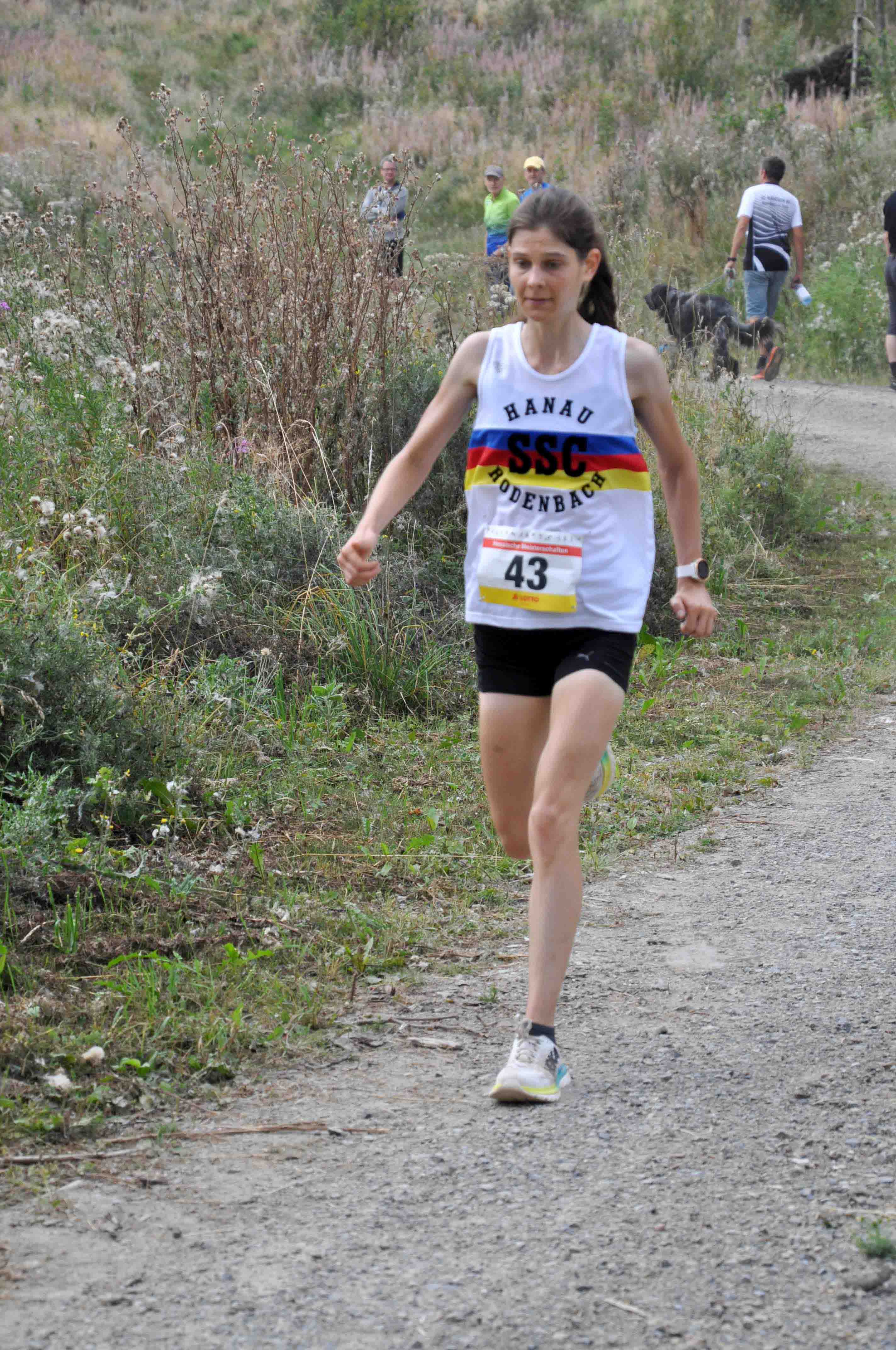 Ein ähnliches Bild bot sich bei den Frauen zumindest für die Siegerin. Clara Costadura, Spiridon Frankfurt, deutete ebenfalls auf den ersten 100 m an, dass der Sieg nur über sie ging. Mit ca. zwei Metern Abstand folgte ihr Sarah Winterstein, SSC Hanau-Rodenbach. Nach 48:16 min. beendete Clara ihr Rennen als Hessische Meisterin. Kurz vor dem Ziel gab es für sie jedoch einen Schreckmoment, als ein SSC-Nachwuchsläufer meinte, sie unbedingt noch überholen zu müssen. "Ich hatte gar nicht damit gerechnet und mich deshalb erschrocken", meinte sie anschließend. Mit 37 sec. Rückstand wurde Maja Severloh, SSC Hanau-Rodenbach, Vizemeisterin, vor Susanne Heinbach, LG Wettenberg, die 98 sec. später Dritte, zugleich aber auch Seniorenmeisterin W50 wurde. Auf Platz 4 lief dann Sarah ein.