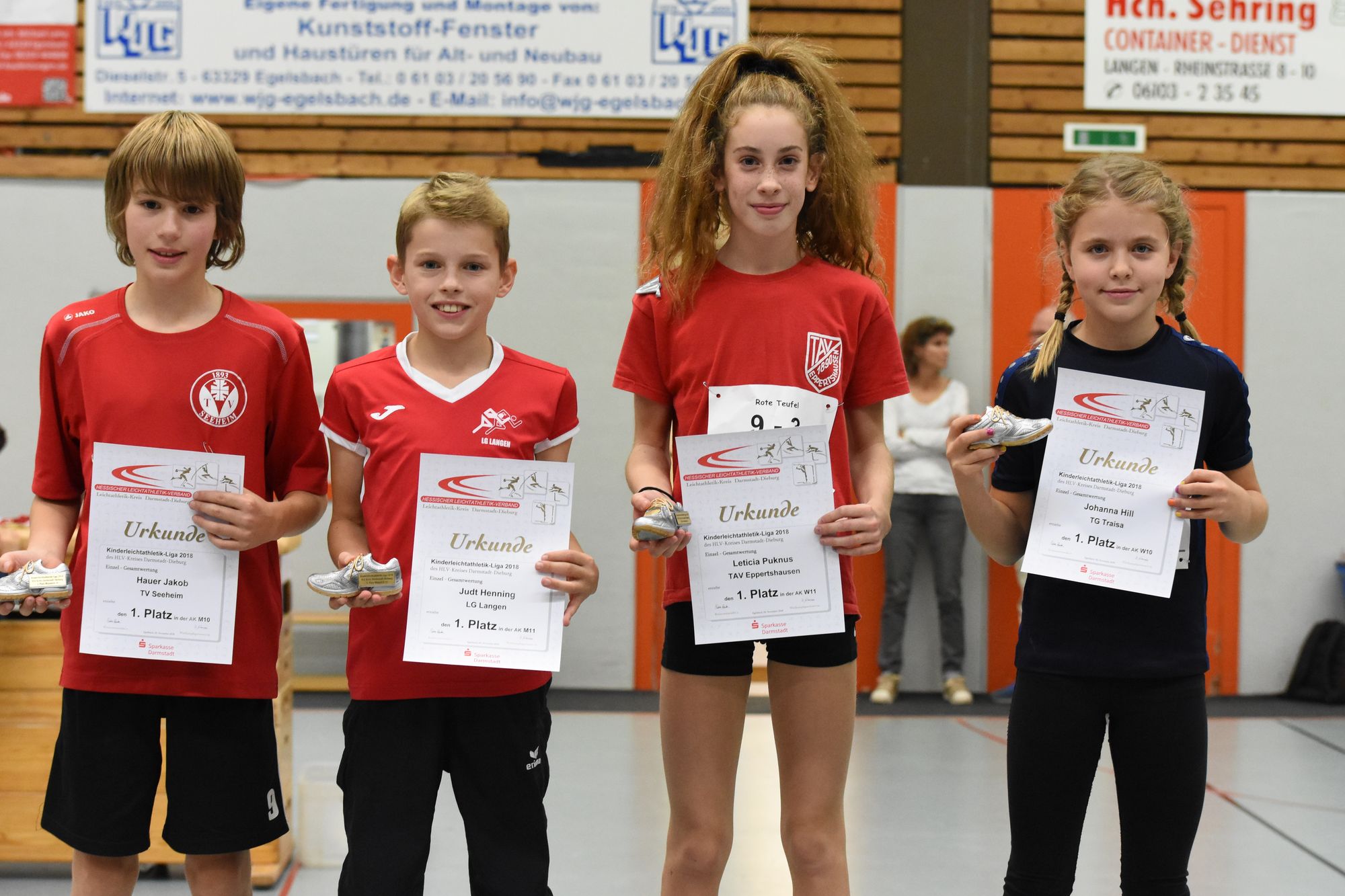 Bei den W10-Mädchen hatte Johanna Hill (TG Traisa) mit 5 Punkten und 3 Tagessiegen einen ebenfalls klaren Vorsprung und konnte den Siegerpokal in Empfang nehmen. Sarah Richter (MTV Urberach, 10 Punkte) und Paula Göller (asc Darmstadt, 15 Punkte) sicherten sich die Liga-Plätze zwei und drei. Bei den M10-Jungen gab es einen Doppelsieg für den TV Seeheim – Jakob Hauer lag in der Schlussrechnung mit 6 Punkten und 2 Tagessiegen um zwei Punkte vor seinem Trainingspartner Lars Wiechmann. Timon Stadie von der SG Egelsbach freute sich mit 11 Punkte über den bronzenen KiLa-Schuh.